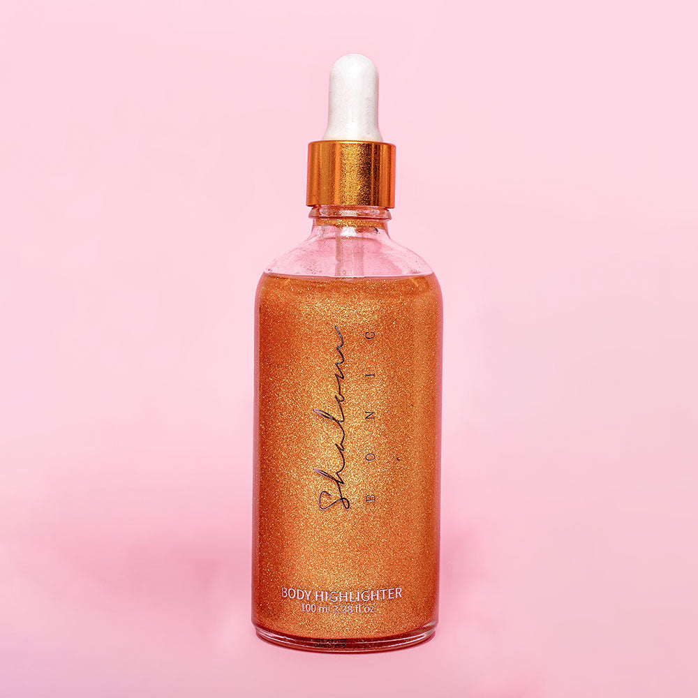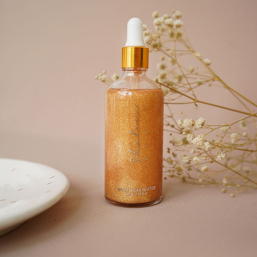 Aceite seco con brillo/ iluminador corporal, color dorado.